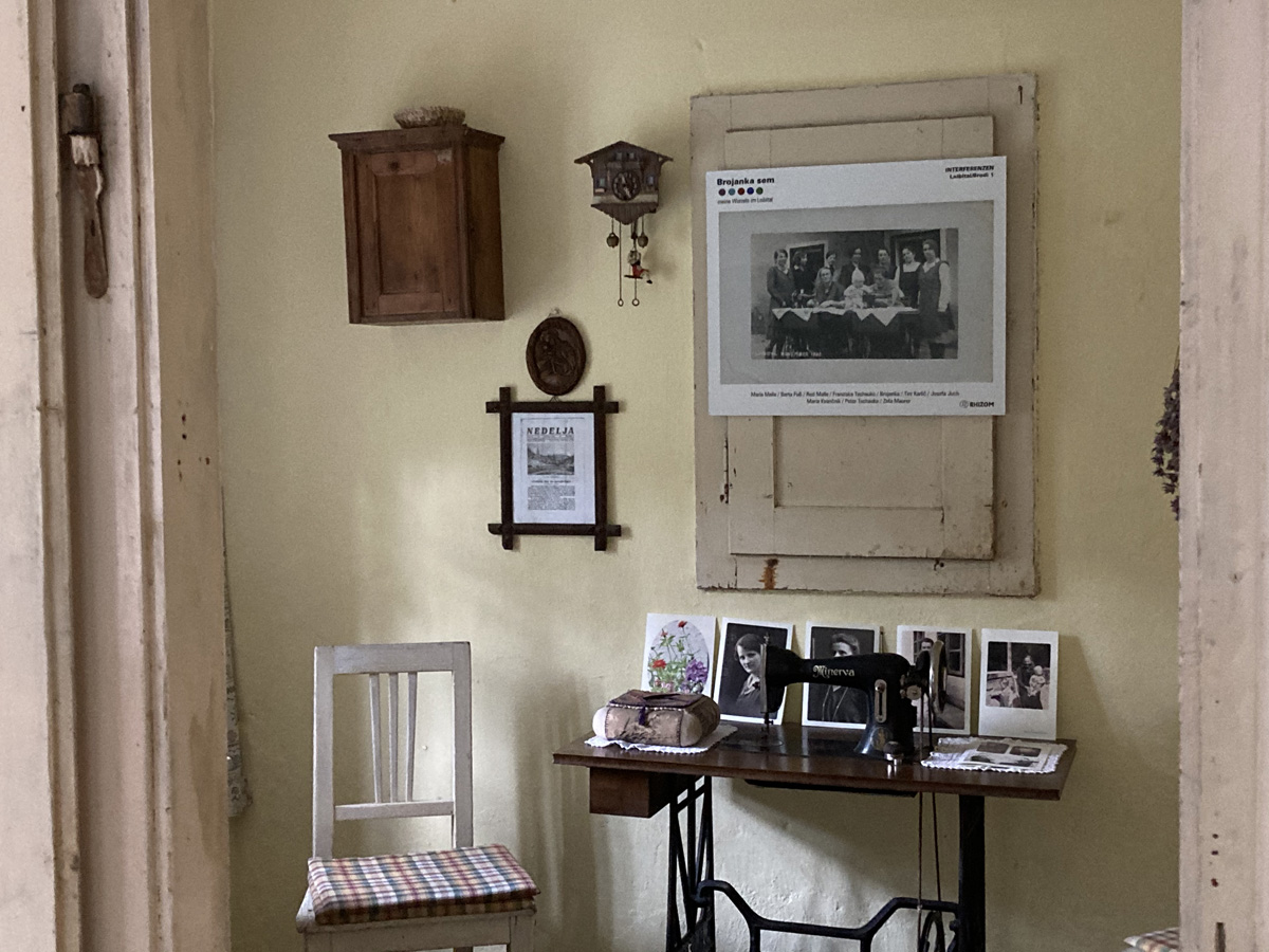 Dem Projekt Das Gedächtnis des Ortes · Kraj in njegov spomin sind, veranstaltet vom Grazer Künstlerkollektiv Rhizom, seit 2015 die INTERFERENZEN, Diskussionen zu den Themen Frauen, Migration, Bildung und Demokratieentwicklung, im Haus Brodi 1, im Pavelhaus in Laafeld bei Bad Radkersburg und in Graz vorausgegangen. Petra Kohlenprath, geboren 1972, gestaltete als Ausgangspunkt für die Gespräche Interventionen mit Materialien aus dem Familienarchiv in Abgleich und in Ergänzung mit in öffentlichen Archiven gefundenen Inhalten. Die Erzählungen ihres Vaters Hanzi Kohlenprath, geboren 1939 im Haus Brodi 1, bildeten dabei eine bedeutende Verbindung zwischen dem Damals und dem Heute. Welche Bedingungen und Möglichkeiten fanden die Bewohner:innen von Brodi 1 in den unterschiedlichen Zeiten vor? Welche Bedingungen und Möglichkeiten haben wir heute? Was ist gleich geblieben? Was hat sich wann verändert?