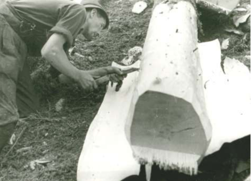 Holzarbeiter mit dem Rindenschinder in der Längapiesting bei Gutenstein; Foto: Zwazek, um 1939.