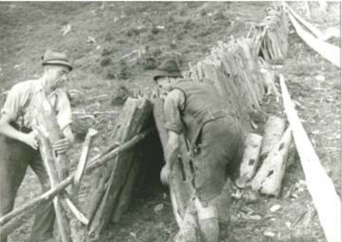 Die angelehnten Rollen werden gegen Nässe abgedeckt; Foto: Zwazeck um 1938.
