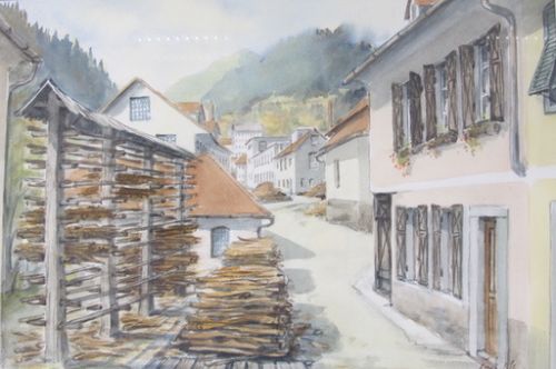 Bild von Marica Šmid. Blick auf das Haus, in dem Jože Gros seine Kindheit verbrachte (rechts), die Harpfe, auf der man Rinde trocknete. Im Hintergrund die Lederwerkstätte Runa.